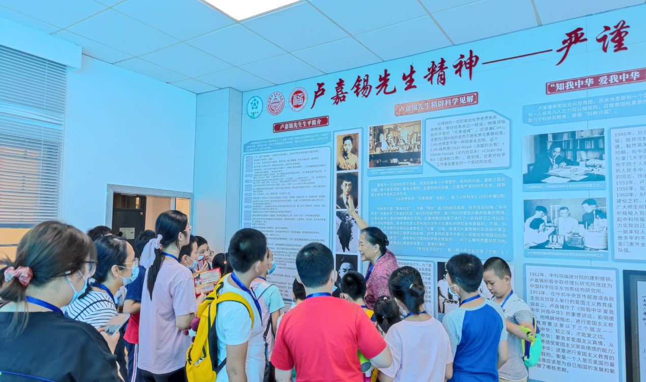 随后,卢嘉锡基金会副理事长卢葛覃女士带领小朋友们参观卢嘉锡精神宣传教育基地。卢女士用讲故事的方式,生动活泼的讲述了卢嘉锡先生的童年趣事,鼓励同学们要善于思考,大胆提出自己的观点,同时展示了卢嘉锡先生工整的实验记录手稿,向孩子们介绍了卢嘉锡先生总结的科研工作者的C3H3品质,即Clear Head(清醒的头脑),Clever Hands(灵巧的双手) 以及Clean Habbit(洁净的习惯)。