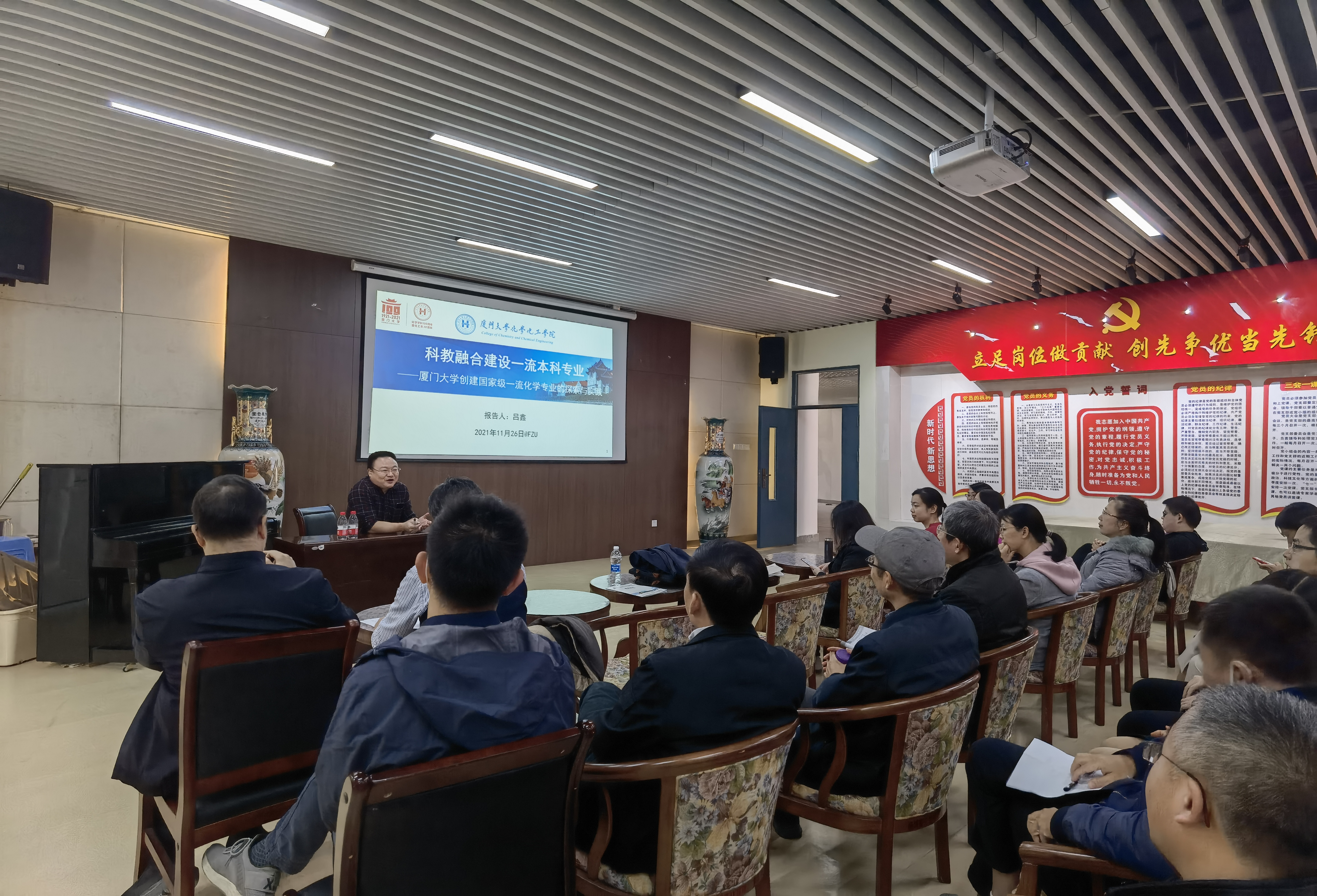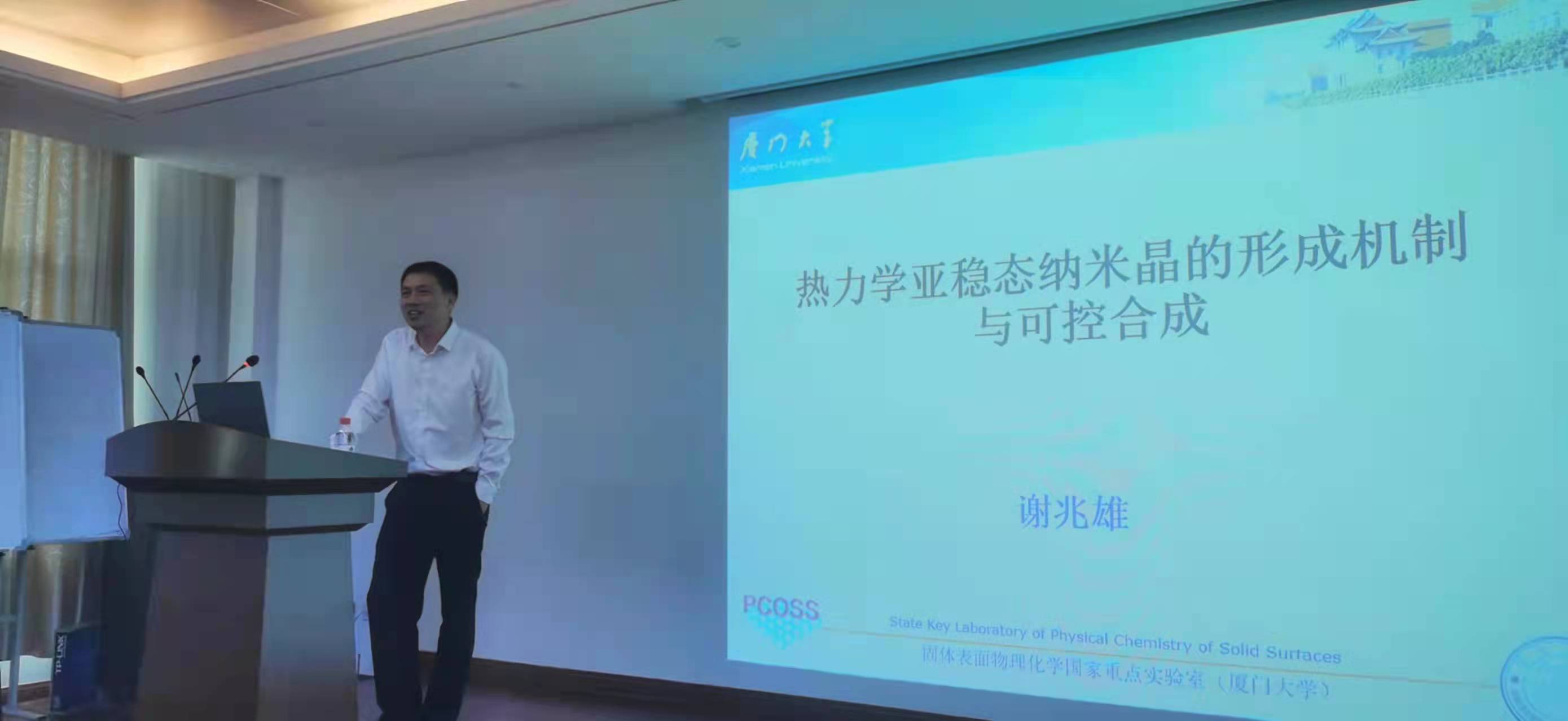 师生作了专题报告,谢兆雄教授作“热力学亚稳态纳米晶的形成机制与可控合成”的学术报告,结合科研工作经历,从“学科交叉与创新”“扎实的基础,创新的源泉”“认真细致的分析,规律发现的前提”“‘想’与‘验’”“生活中处处有科学”等方面分享了自己的科研理念。吕鑫教授作题为“科教融合建设一流本科专业——厦门大学创建国家级一流化学专业的探索与实践”的报告,系统介绍了厦大化学历史沿革与专业定位、特色优势与综合改革、师资队伍与质量保障、专业建设与改革思路等内容。