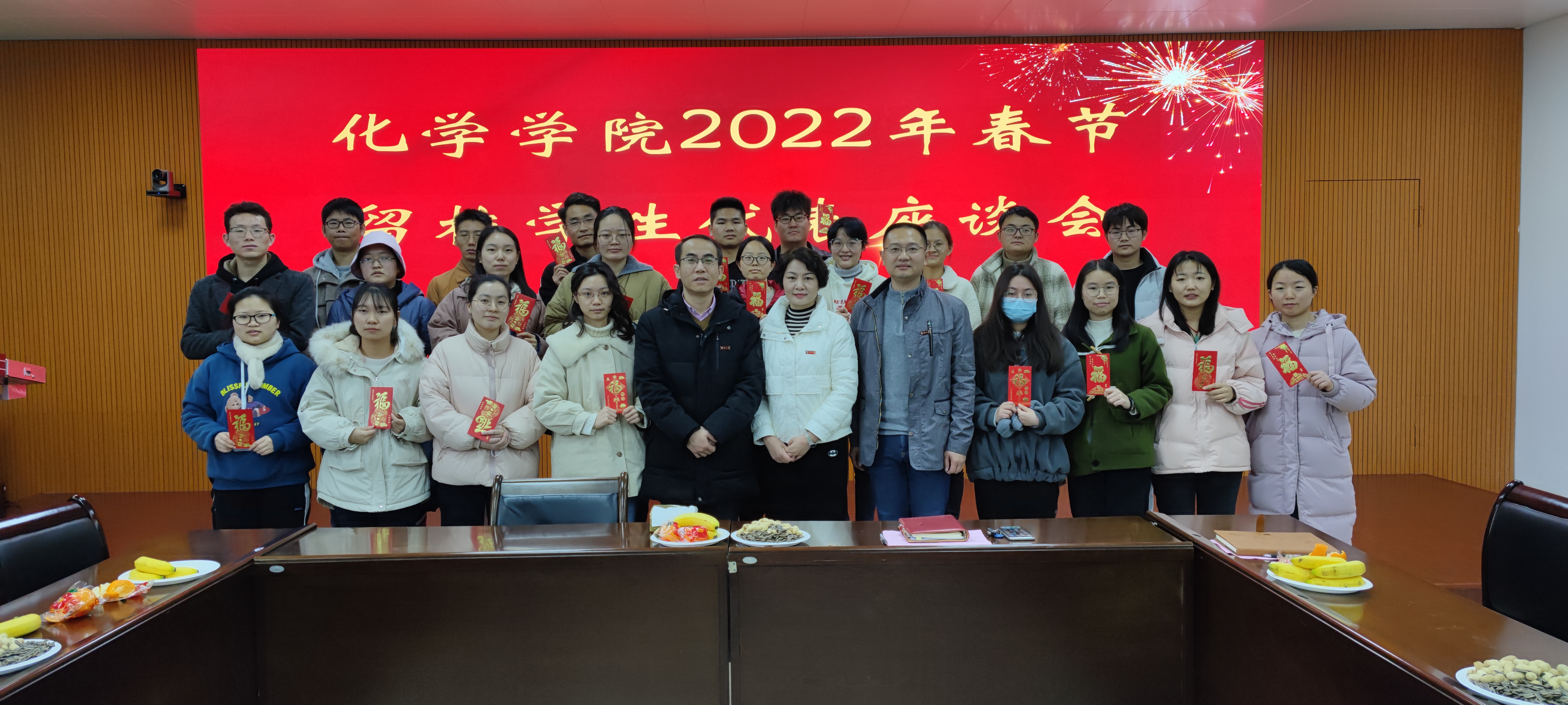 在嘉锡楼413会议室召开2022年春节留校学生代表座谈会。院党委书记张泓、院长郑寿添与留校学生代表欢聚一堂,拉家常,话新春。座谈会由学院党委副书记常凯主持。