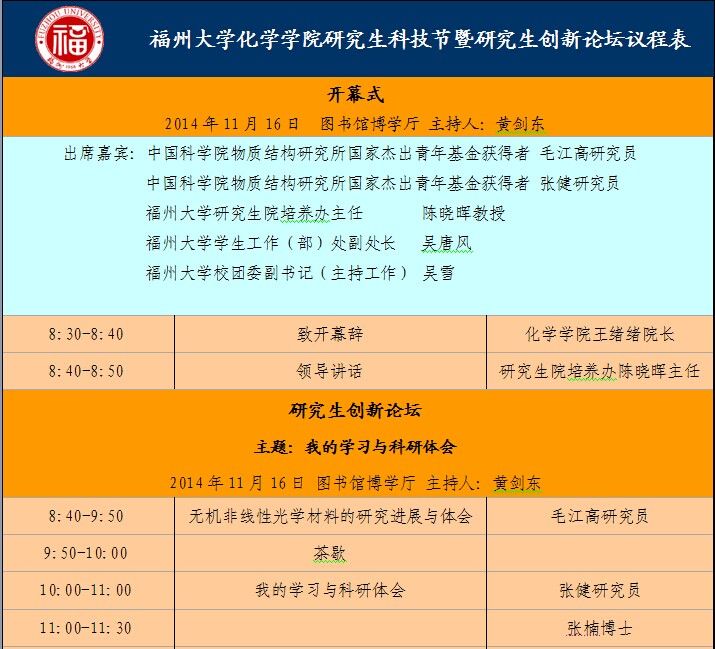 为加强研究生的创新能力培养,学院将举办首届木瓜视频 研究生科技节暨研究生创新论坛,设有“研究生创新论坛”、“硕博学术沙龙”、“博思讲坛”、演讲比赛、科技展等活动内容。首届木瓜视频 研究生科技节暨研究生创新论坛开幕式将于11月16日上午8:30在图书馆博学厅举行,特邀中科院物质结构研究所毛江高研究员、张健研究员为木瓜视频 师生讲学。开幕式要求全体研究生出席,欢迎各位老师参加。