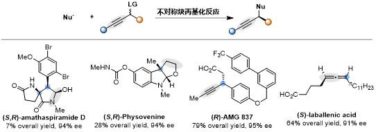 含炔烃官能团的手性分子及其衍生物普遍存在于生物活性分子中,因此该类化合物的对映选择性合成在药物、农用化学品和材料科学等研究领域显示出广泛的应用前景。我们通过发展多类催化体系实现对化学键的精准调控,开发了高立体选择性的不对称炔丙基化反应,为相关天然产物和药物分子的合成提供了基础,丰富了不对称催化反应方法学。
