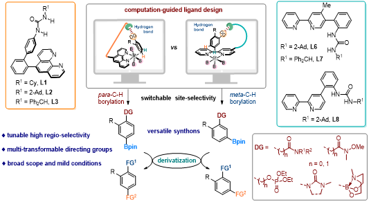 报告内容简介:我们以DFT计算为指导,通过精准调控配体的几何形状和距离,以及非共价相互作用,设计合成了含邻菲罗啉骨架和联吡啶骨架的两大类配体,通过底物与配体之间的氢键识别导向作用,成功实现了铱催化的芳香酰胺、磷酸酯、硼酸酯等的可调控的间位和对位选择性硼化反应。该反应具有广泛的底物范围和良好的官能团兼容性,再结合多转化导向基的丰富转化,可以从多维度进行后期官能团化,从而快速高效地实现了多取代芳烃的合成。