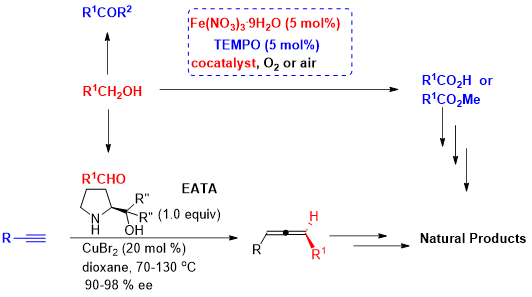 醛、酮、羧酸和酯都是基本化学品,在学术实验室、工业和日常生活中被广泛应用。这个报告将介绍我们从2009年以来发展的Fe(NO3)3-TEMPO-催化的醇的有氧氧化反应。反应使用纯氧气或空气作为氧化剂。随后将讨论这些反应在有机合成中的应用。