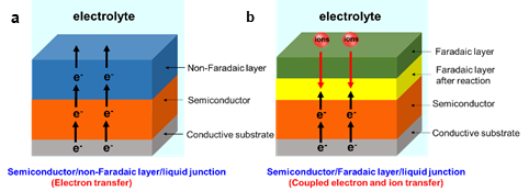 法拉体(Farador)是一种电子离子耦合传输导体, 半导体和法拉体接触形成法拉第结 (图1)[1]。传统半导体结载流子为电子,界面电荷转移不会引起化学变化。而法拉第结载流子为耦合电子和离子,界面电荷转移则会引起化学变化。法拉第结可用于各种太阳能转化与存储器件[2-8]。目前法拉第结界面电荷传输机制建立在半导体结能带理论的基础上,然而经典能带理论无法解释其特殊界面电荷传输行为。因此,阐明法拉第结界面电荷传输机制,对建立半导体表界面新理论、提高器件转化效率以及开发太阳能转换新器件具有非常重要的意义。