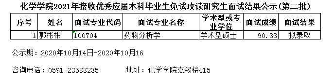 2021年接收优秀应届本科毕业生免试攻读研究生面试结果(第二批)公布如下: