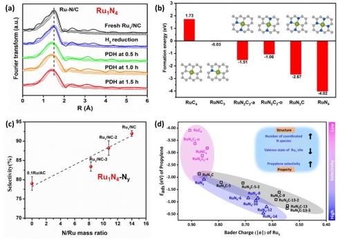 图2:(a) H2还原和PDH反应原料气下的Ru1/NC催化剂EXAFS谱图,(b) 不同内壳层配位环境下RuNxC4-x的形成能, (c) PDH选择性对不同N/Ru质量比的响应,(d)不同配位环境下丙烯在Ru1/NC上的吸附能与Ru1电荷的关系图。