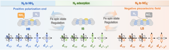 SAs因其具有原子分散和独特的不饱和配位结构,为N2吸附和活化提供了均匀和明确的活性位点。但特定的SA催化剂具有特定的配位环境和电子结构,限制了同时促进氧化和还原反应的可能性。过渡金属(Fe、Co、Ni等)由于d轨道中电子填充形式的多样性,从而表现出独特的多自旋态,并且自旋态对于调节催化热力学和动力学过程至关重要。压电极化场作为一种机械力自驱动的高效电场,不仅可以促进不同极化端形成分离的氧化还原反应域,有利于还原和氧化反应的分别发生。同时,将压电极化场引入到过渡金属SA光催化体系中,可以实现不同极化端自旋态的独立调控,有望同时促进氮氧化和氮还原反应的发生。有鉴于此,通过浸渍和煅烧将Fe SAs锚定在铁电体OvBTO上。同时实现氧化还原域的空间分离和Fe自旋态的动态双向切换,从而促进全固氮反应的高效进行。