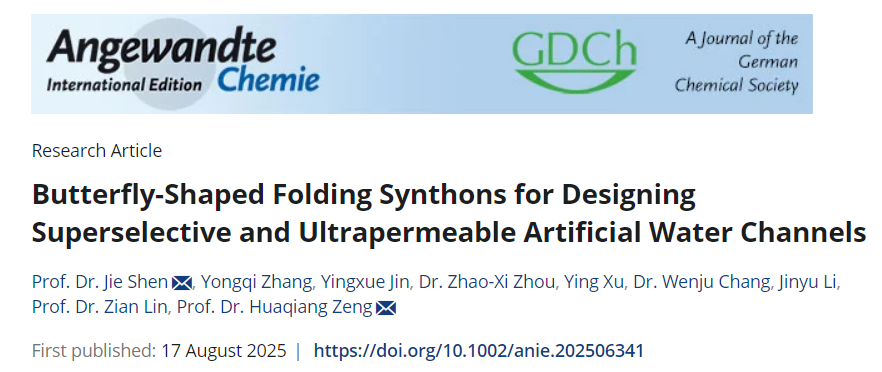 论文信息Jie Shen,+,* Yongqi Zhang,+ Yingxue Jin, Zhao-Xi Zhou, Ying Xu, Wenju Chang, Jinyu Li, Zian Lin and Huaqiang Zeng*. Butterfly-Shaped Folding Synthons for Designing Superselective and Ultrapermeable Artificial Water Channels. Angew. Chem. Int. Ed. 2025, e202506341. DOI: 10.1002/anie.202506341