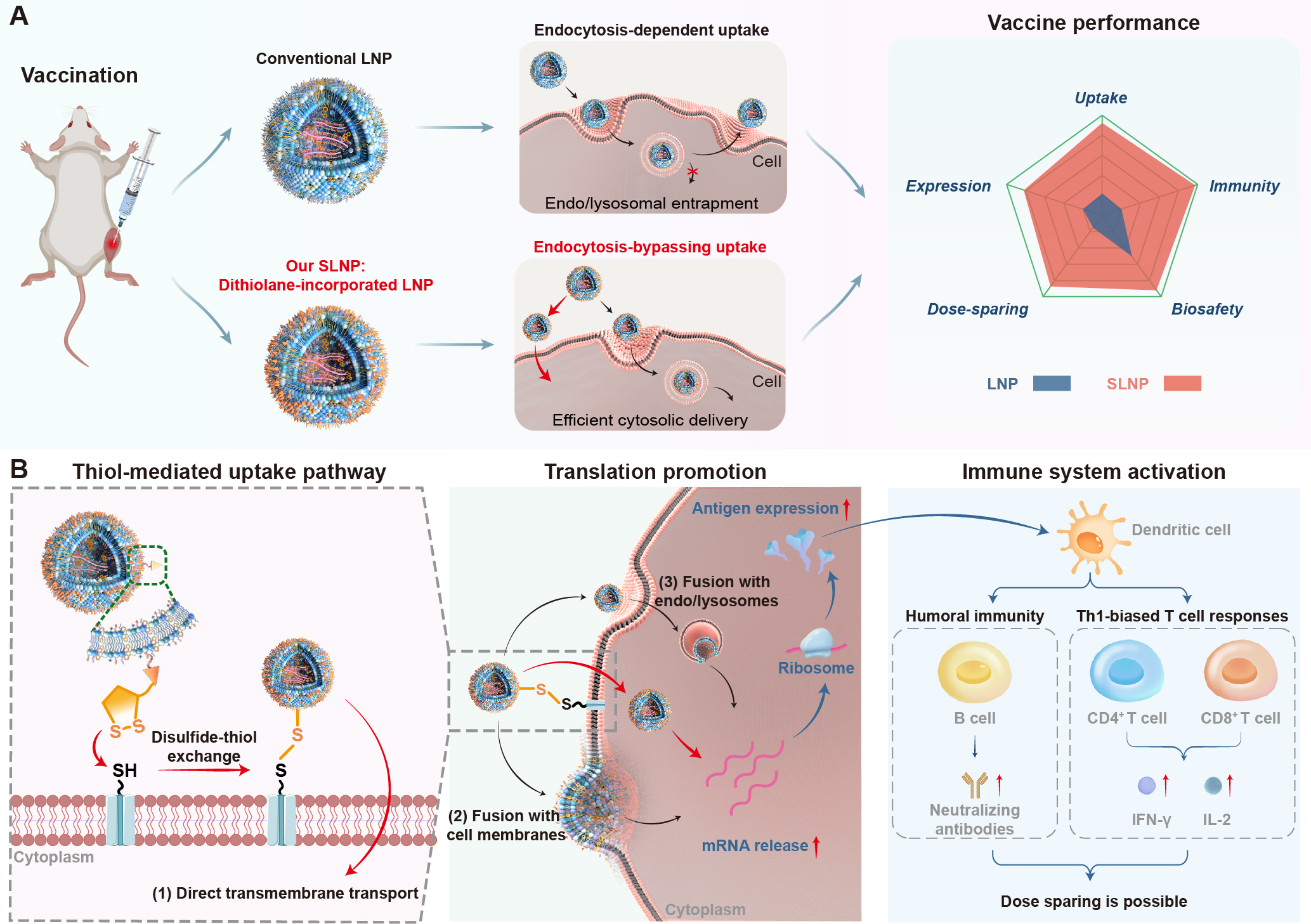 mRNA疫苗作为新兴的疫苗平台,具有开发周期短、生产便捷等优势。然而,其核心挑战之一在于如何将mRNA安全、高效地递送至细胞质,并避免在细胞内吞过程中被内体-溶酶体降解,这正是当前临床转化的主要障碍。为解决这一难题,研究团队巧妙地将二硫戊环这一具有特殊化学活性的基团引入到脂质纳米颗粒(LNP)的组分中,设计并合成了新型的硫醇介导摄取脂质纳米颗粒(SLNP)。这种化学修饰赋予了SLNP独特的“细胞穿透”能力:当SLNP与细胞膜接触时,其表面的二硫戊环能与细胞膜上的硫醇基团发生动态共价二硫-硫醇交换反应。这种新颖的相互作用机制使得SLNP能够绕过传统的、能量依赖的内吞途径,实现mRNA的直接跨膜转运或更高效的内吞逃逸,从而将mRNA直接递送至细胞质,有效避免了内体中的降解。研究结果表明,与传统LNP相比,该SLNP递送系统在体内外均展现出卓越的性能,显著提升了接种小鼠体内的抗原表达效率,诱导了更为强劲的体液免疫响应,产生了更高效价的中和抗体。这些突破性成果有力地证明了SLNP在克服“内体俘获”限制方面的巨大潜力,特别是在实现剂量节约方面有望成为现有商业化mRNA疫苗的有力替代方案。