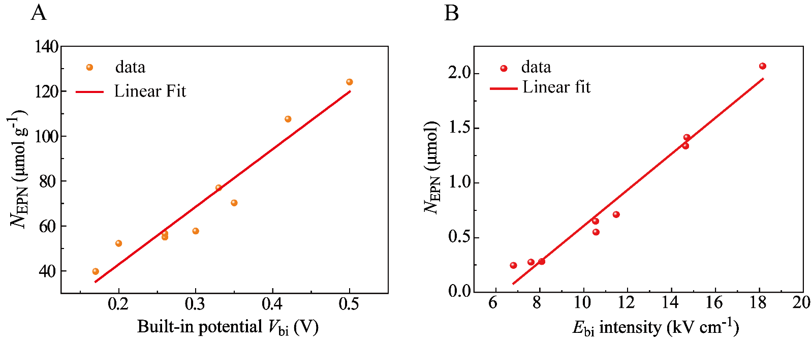 沈锦妮副教授和张子重教授课题组在前期碳化硅基异质结的研究基础上(J. Am. Chem. Soc. 2018, 140, 14595.,Nat. Commun. 2020, 11, 3043.,J. Colloid Interface Sci. 2022, 622, 31.,Chin. J. Catal. 2023, 50, 239.,Inorg. Chem. 2024, 63, 14591.),分别通过水热水解和磁控溅射方法制备了粉末和单晶碳化硅/三氧化钨(SiC@WO3)异质结光催化剂。随后,他们概述了半导体物理学中关于大块半导体异质结内建电场强度或内建电势的定义、理论计算和测定原理,建立了测定粉末异质结样品的内建电势(Vbi)和单晶异质结样品的内建电场(Ebi)的方法;测定了两个样品对于CO2与H2O反应的光催化活性和产物分布,引入有效光电子利用总数(NEPN)表示光催化活性;对Vbi或Ebi与NEPN进行定量关联分析,获得原创性发现。