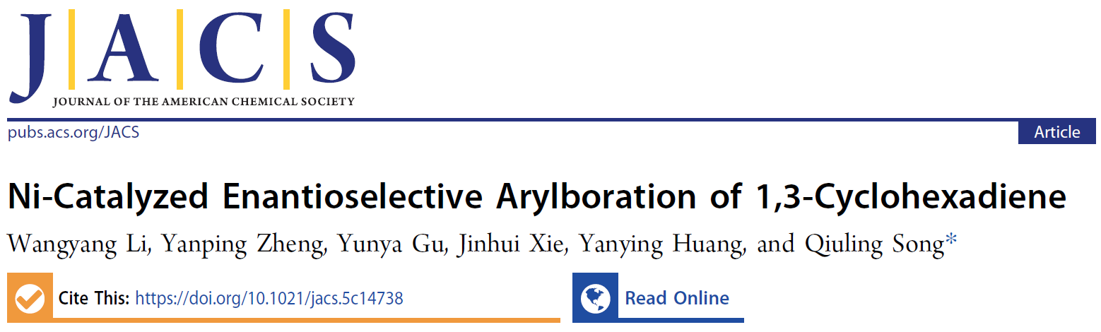 论文信息:"Ni-Catalyzed Enantioselective Arylboration of 1,3-Cyclohexadiene", Wangyang Li, Yanping Zheng, Yunya Gu, Jinhui Xie, Yanying Huang, and Qiuling Song*, J. Am. Chem. Soc. 2025, DOI: 10.1021/jacs.5c14738.