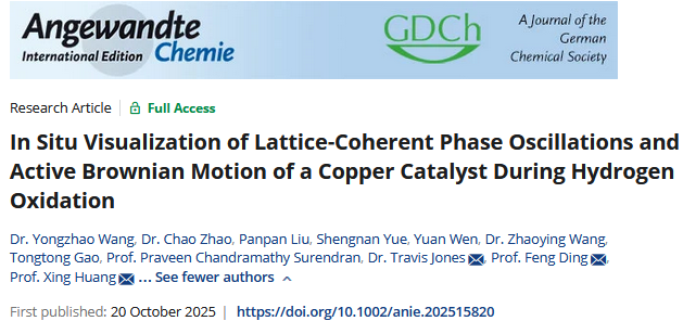 论文信息:Yongzhao Wang, Chao Zhao, Panpan Liu, Shengnan Yue, Yuan Wen, Dr. Zhaoying Wang, Tongtong Gao, Praveen Chandramathy Surendran, Travis Jones,* Feng Ding,* and Xing Huang* In situ Visualization of Lattice-Coherent Phase Oscillations and Active Brownian Motion of a Copper Catalyst during Hydrogen Oxidation. Angewandte Chemie International Edition 2025, e202515820. //doi.org/10.1002/anie.202515820