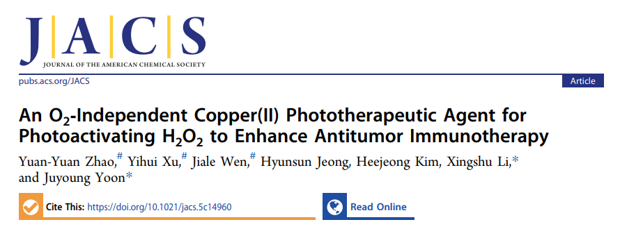 李兴淑教授团队最新研究成果以“An O2-Independent Copper(II) Phototherapeutic Agent for Photoactivating H2O2 to Enhance Antitumor Immunotherapy”为题发表在在国际知名学术期刊《Journal of the American Chemical Society》。