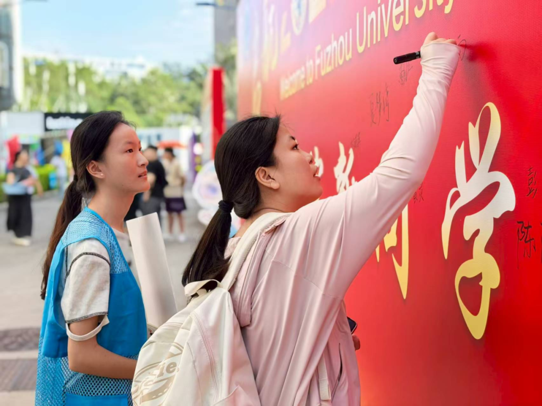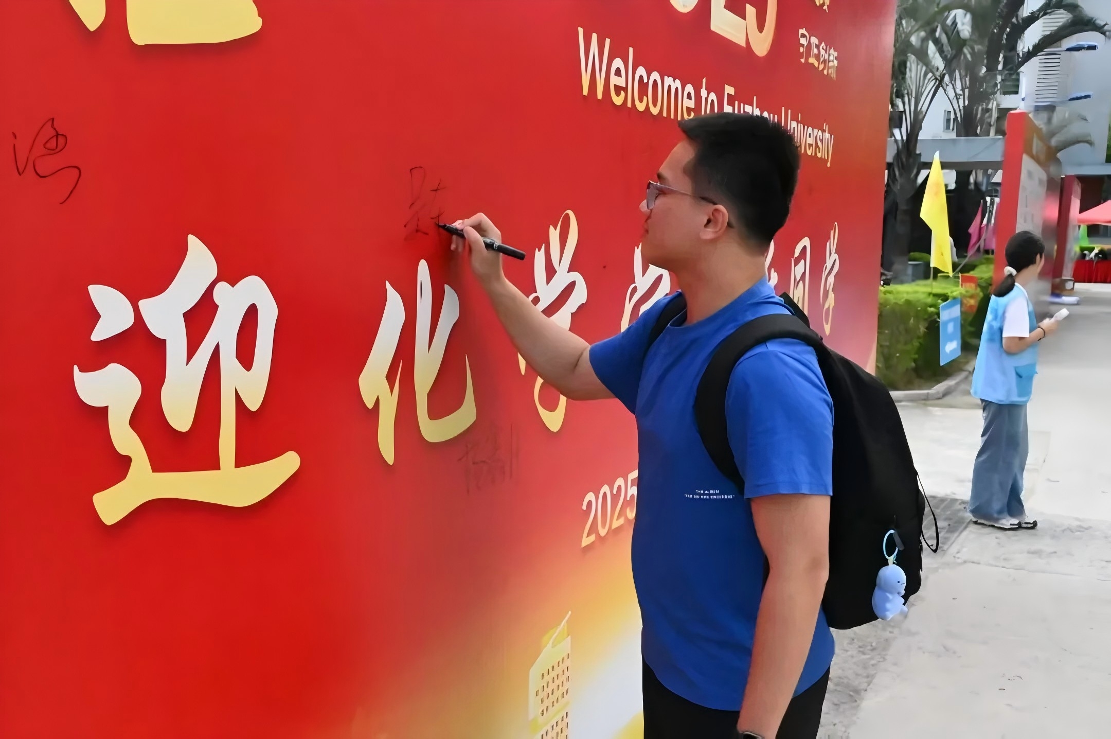 新生签名墙前,同学们郑重签下自己的名字,许下对大学生活的美好期待。一笔一划,不仅是对大学生活的向往,更是对自我成长的一份庄重承诺。