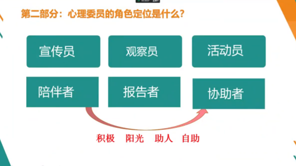 随后,福建中医药大学朋辈互助员丁梦婷同学以《心委那些小事》为题,结合担任心理委员的实际经历,从“宣传员、观察员、活动员、陪伴者、报告者、协助者”六个角色出发,系统阐述了心理委员的职能定位,清晰而立体地呈现了其在班级心理健康工作中的重要作用。