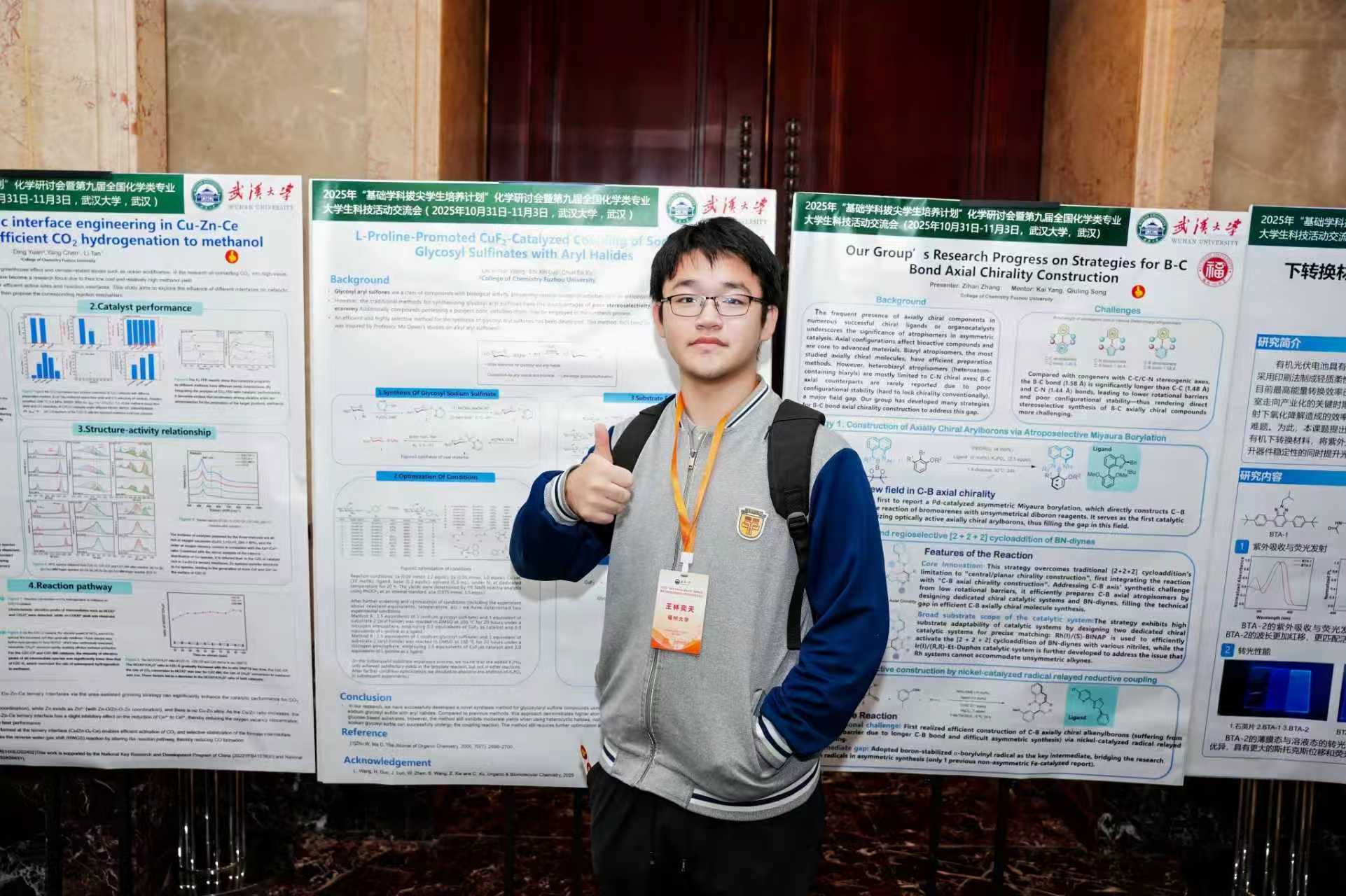 在本次“基础学科拔尖学生培养计划”化学研讨会中,我的墙报主题是《用于CO2高效加氢制甲醇Cu-Zn-Ce催化剂的协同界面工程》。在墙报沙龙环节,我与各大高校学子进行学术分享与交流,这让我在学术认知与实验设计上都有了全新收获。未来,我将把会议中的收获转化为研究的动力,在深耕自身领域的同时,主动打破学科与地域壁垒,朝着更具深度与温度的学术方向前行。