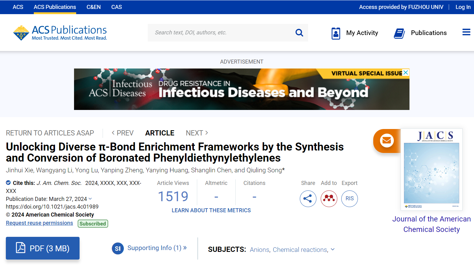 宋秋玲教授课题组在《Journal of the American Chemical Society》在线发表了题为“Unlocking Diverse π-Bond Enrichment Frameworks by Synthesis and Conversion of Boronated Phenyldiethynylethylenes”的研究论文,该方法为构建具有广泛底物范围、高产率和良好的化学、立体和区域选择性的原始和多样化的BPDEE提供了一条简单的路线。四取代烯烃具有四取代C=C核,广泛应用于材料科学、生物医学和化学。...