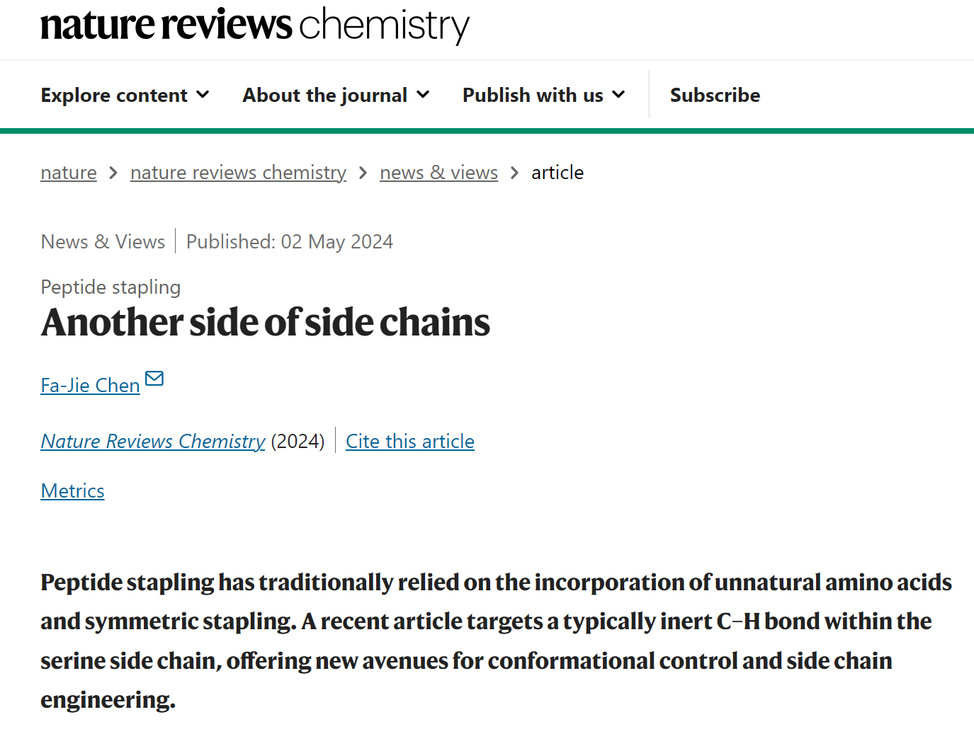陈发杰副教授应邀在国际顶尖学术期刊 《Nature Reviews Chemistry》(Q1,影响因子36)发表题为“Another side of side chains”的新闻与观点(“News & Views”)论文,对兰州大学许兆青课题组在天然多肽非对称装订领域的最新突破性进展进行了评述和展望。陈发杰副教授是木瓜视频