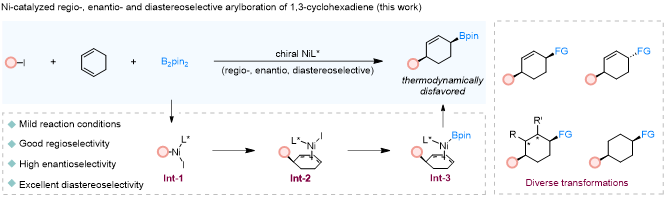 宋秋玲教授课题组在国际权威期刊《J. Am. Chem. Soc.》上发表题为“Ni-Catalyzed Enantioselective Arylboration of 1,3-Cyclohexadiene”的研究成果。该研究发展了一种新颖高效的镍催化体系,利用易得的芳基碘化物和双联频哪醇硼酸酯(B₂pin₂),实现了1,3-环己二烯的高区域、对映及非对映选择性芳基硼化反应,为合成具有重要应用价值的手性硼化1,4-顺式-环己烯衍生物提供了直接高效的路径。多取代六元环结构多样...