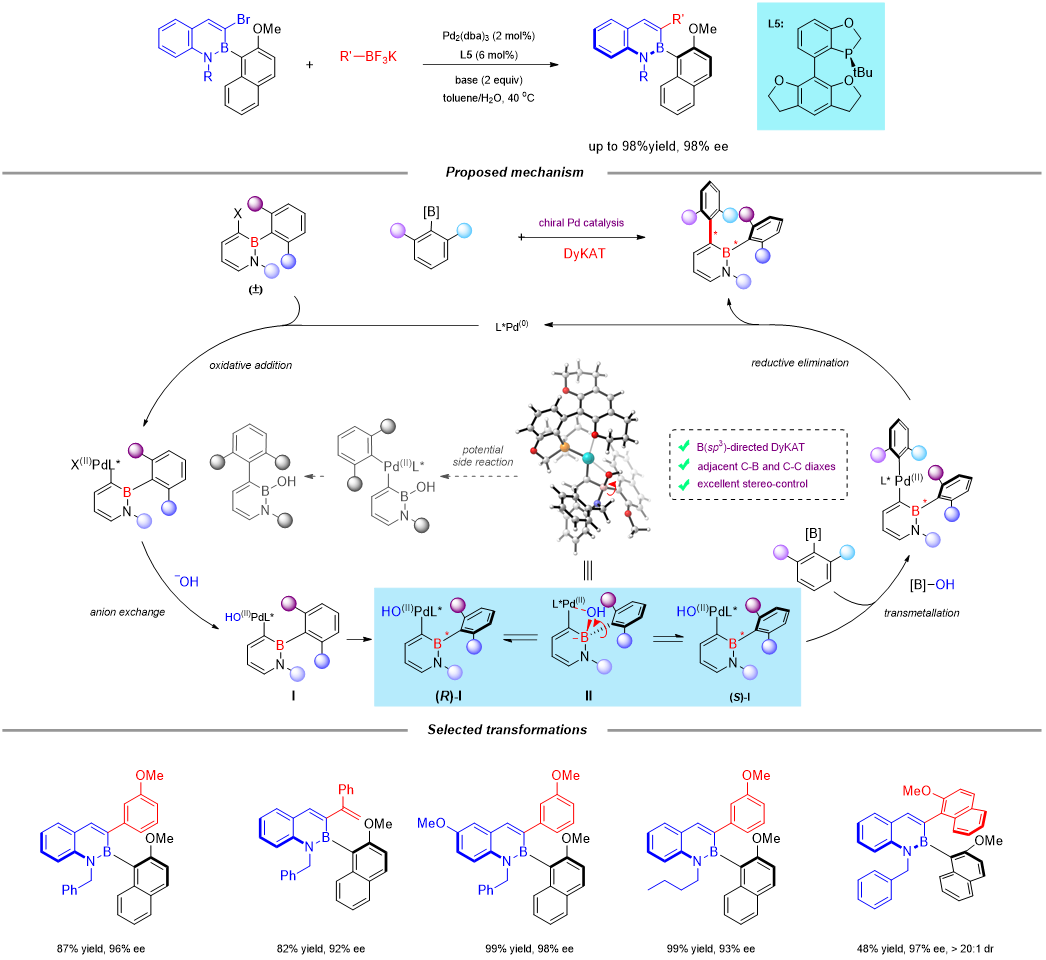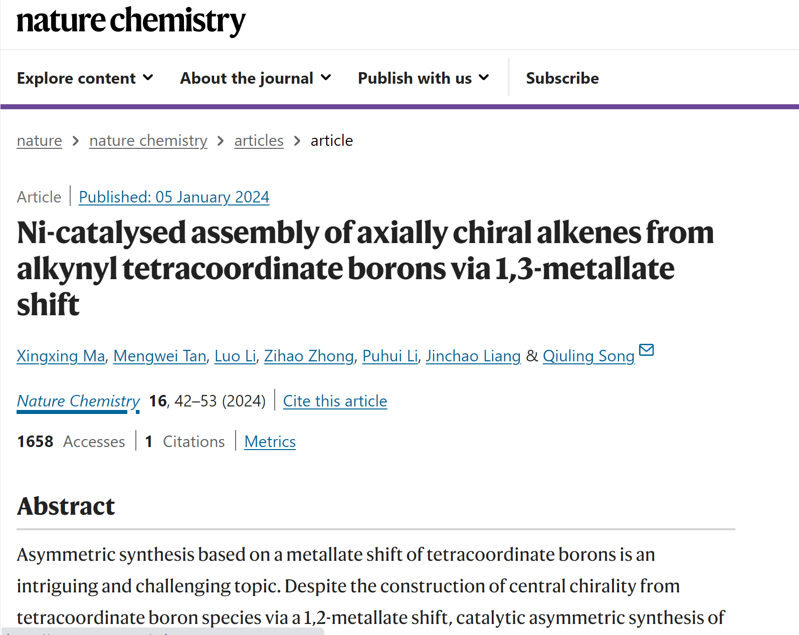 宋秋玲教授课题组在《自然化学》(Nature—Chemistry)在线发表了题为"Ni-catalyzed assembly of axially chiral alkenes from alkynyl tetracoordinate borons via 1,3-metallate shift"的研究论文,设计并报道了对映、区域和阻旋选择性良好的镍催化策略,通过炔基四配位硼的1,3-迁移构建一系列轴手性烯烃化合物。近些年来,由于四配位硼的独特性质,对其研究也越来越广泛。四配位硼化合物不仅是许多有机硼...